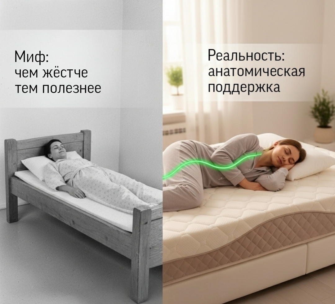 Многие до сих пор уверены, что чем жестче матрас, тем он полезнее для спины. Этот стереотип унаследован ещё со времён, когда ортопедический матрас ассоциировался с доской. Но современные технологии сна доказывают обратное: чрезмерная жёсткость не всегда полезна.. На самом деле даже среди жёстких матрасов важно выбирать модель с правильной анатомической поддержкой, а не просто «твёрдую поверхность».