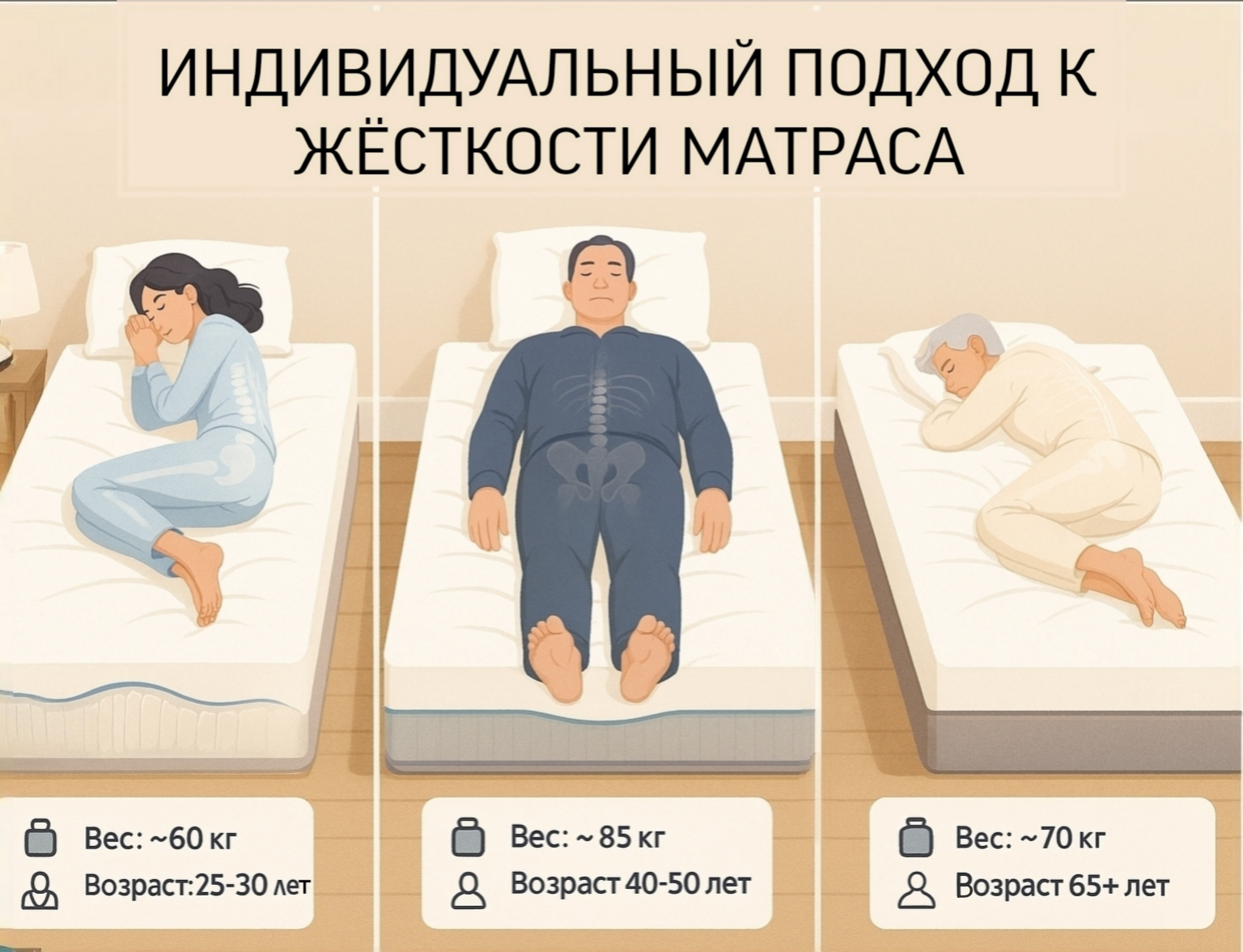 Возраст. Молодым людям комфортнее средняя жёсткость, тогда как пожилым — чуть мягче, чтобы снизить давление на суставы.